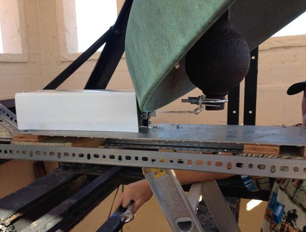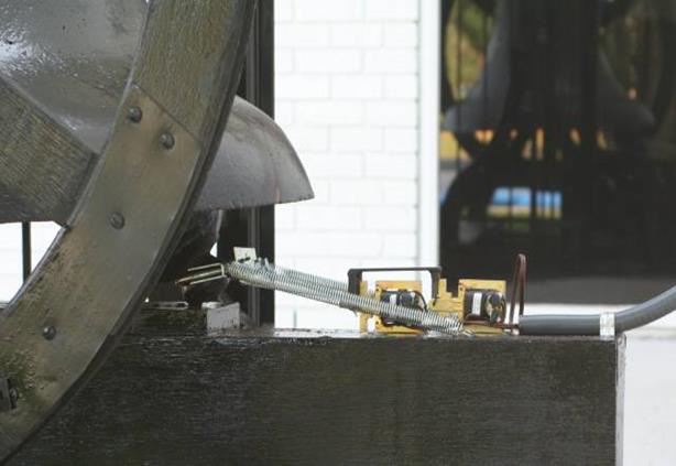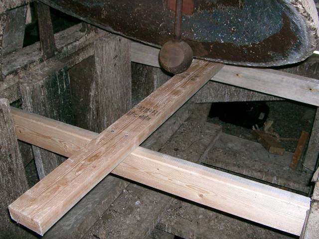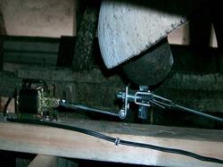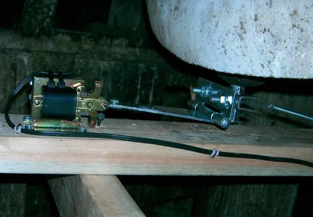 to the cap nut at the top of the cradle but then up to the top rear of the metal bell mounting frame. The solenoid is mounted to an added wooden subframe that