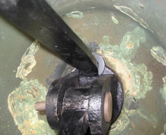 the cap nut at the top of the cradle then to the rear of wooden bell